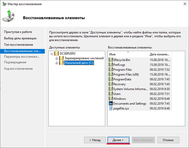 Восстанавливаемые элементы – выбираем Локальный диск (С:). >>Далее.