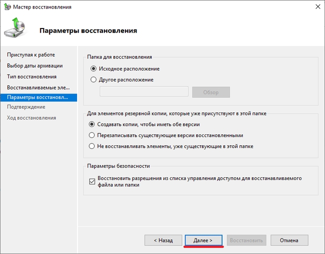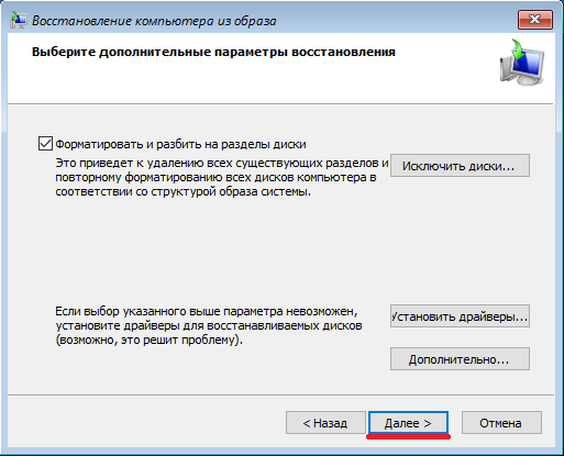 Параметры восстановления – можно ничего не изменять. >>Далее.