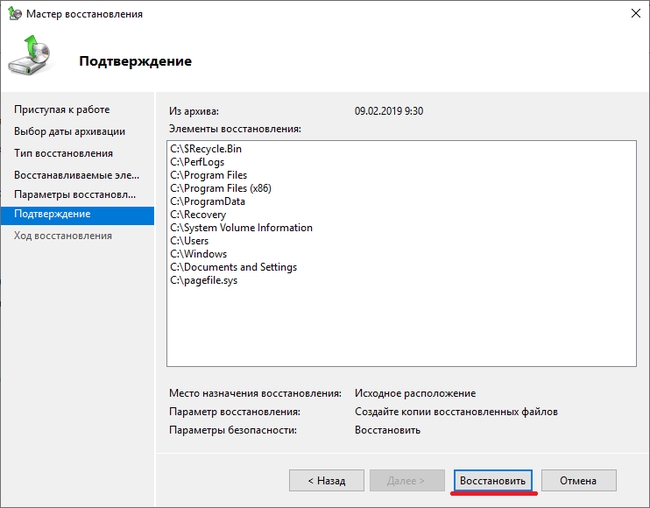 Подтверждаем восстановление, нажав кнопку «Восстановить».