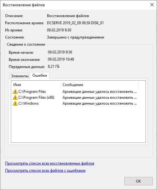 По завершению восстановления в главном окне приложения можно посмотреть, какие возникли ошибки.