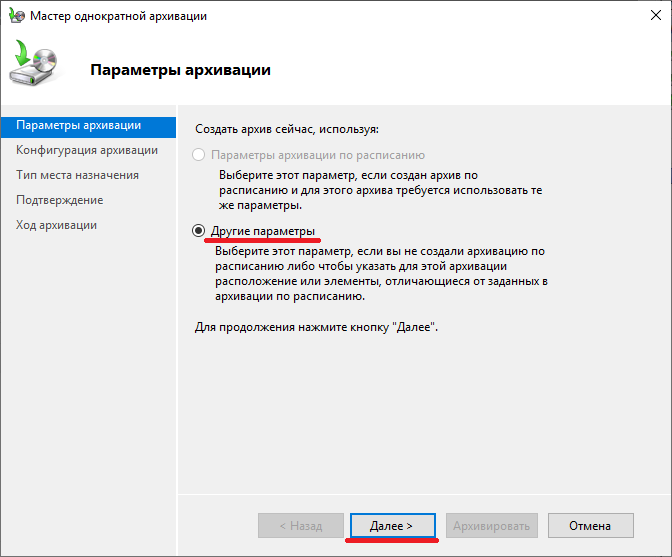 Запускаем систему архивации Windows Server как описано выше. Выбираем однократную архивацию.