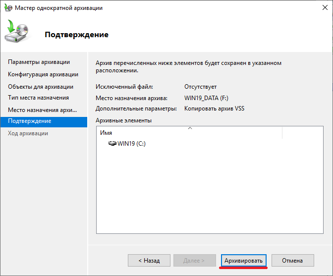 Проверяем и подтверждаем выполнение резервной копии, нажав кнопку «Архивировать»