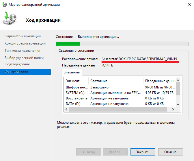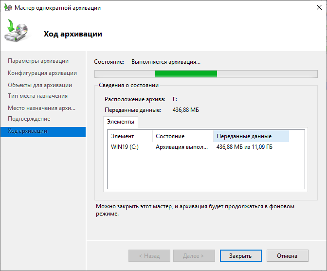 Далее можно пронаблюдать за ходом архивации. Можно нажать кнопку «Закрыть» при этом архивация продолжится и завершится сама собой, о чем оповестит флажок в диспетчере серверов.
