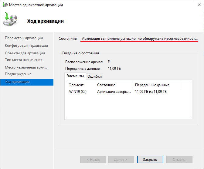 По завершении архивации в строке состояния можно посмотреть подтверждение об успешном выполнении. В нашем случае возникла какая-то проблема.
