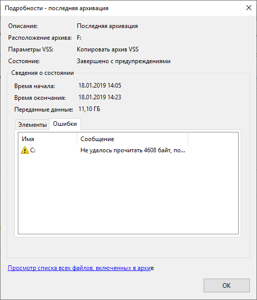 Подробный текст ошибки гласит: Не удалось прочитать 4608 байт, поскольку на жестких дисках имеются поврежденные кластеры; данные в поврежденных кластерах не архивируются. Запустите для жесткого диска команду CHKDSK /R, а затем выполните архивацию повторно.