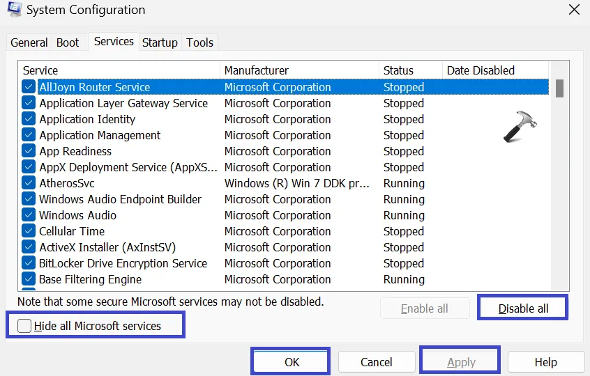 3. После этого нажмите «Отключить все», чтобы отключить все службы, не принадлежащие Microsoft.