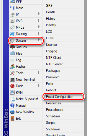 1. Находим слева вкладку «System» и заходим в неё. Там выбираем «Reset Configuration»;
