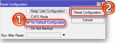 2. Появляется окно, в котором ставим галочку возле «No Default Configuration» и выбираем «Reset Configuration».