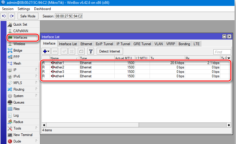 Названия портов можно посмотреть в разделе «Interfaces Winbox».