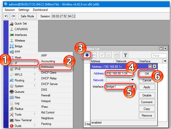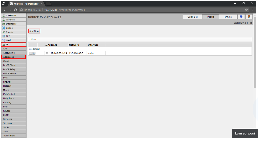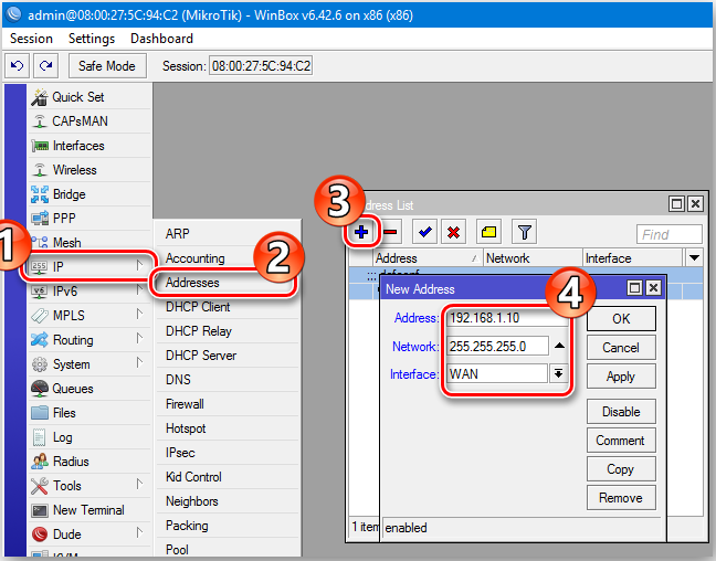 1. В разделе «IP» — «Adresses» делаем назначение нужного IP-адреса порту WAN;