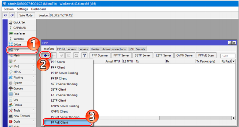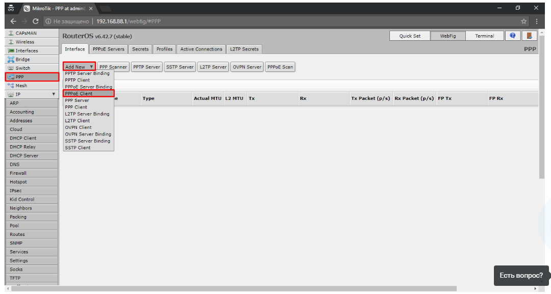 1. Находим слева вкладку «PPP», находим список «Add New» и выбираем в нём «PPPoE Client»;