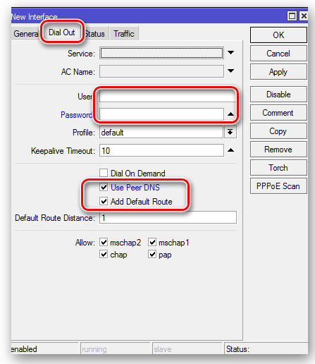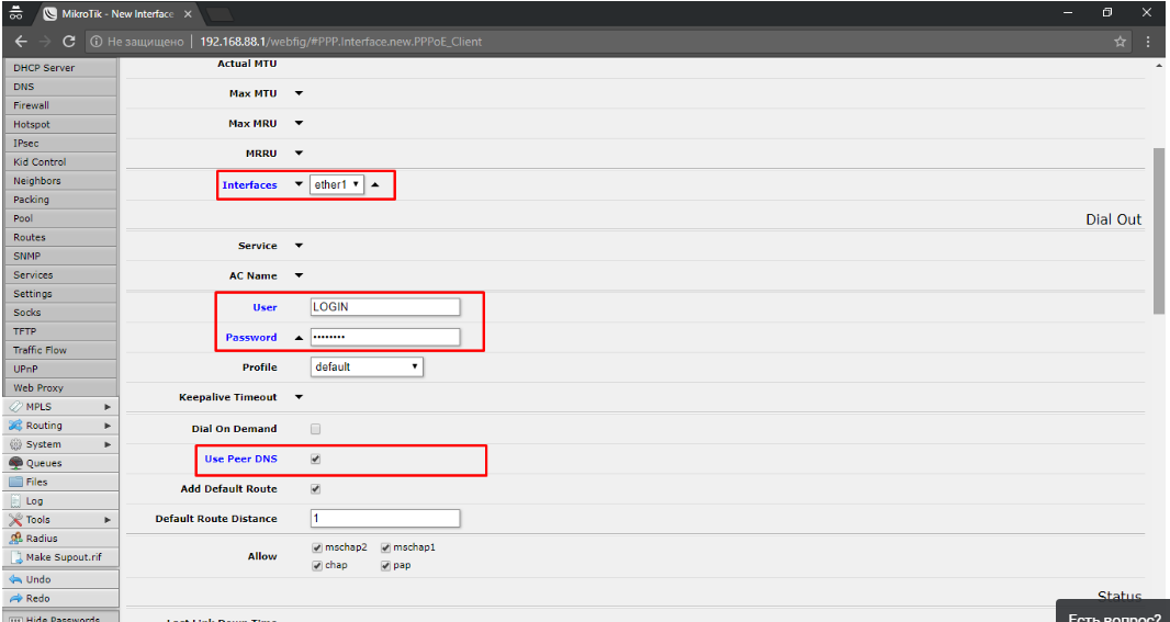 2. Делаем выбор в «Interfaces» порта, через который будет идти подключение интернета. Затем, в поле «User» пишем свой логин, а в поле «Password» пароль. После этого выбираем «Use Peer DNS»;