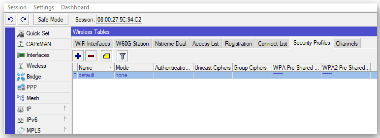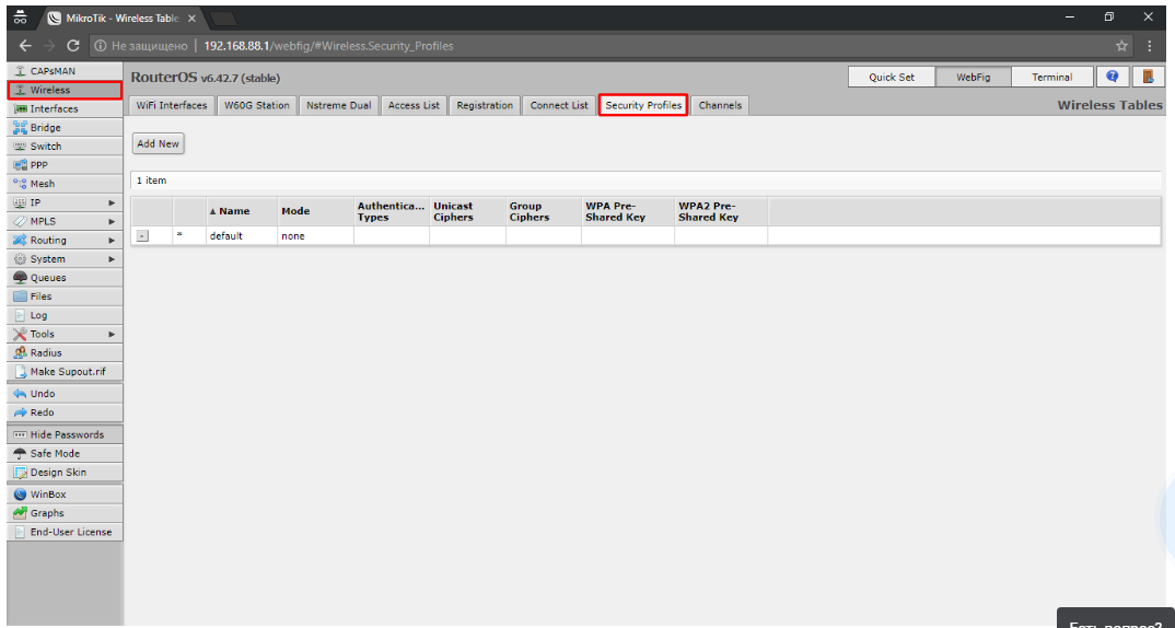 Мы почти закончили настройку wi-fi. Остаётся перейти в раздел «Security Profiles» и нажать там на «default».