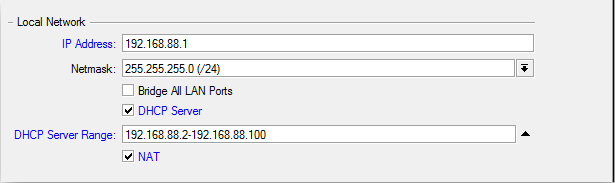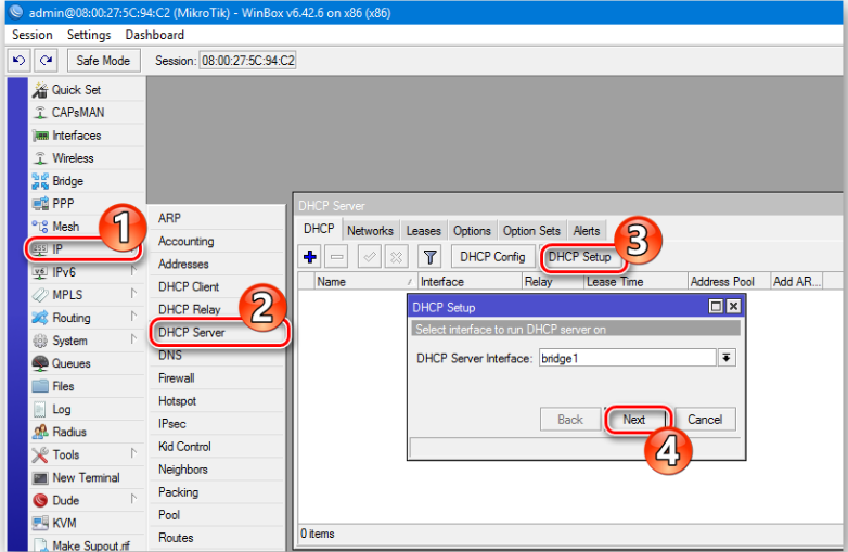 Располагается там же, в окне «Quick Set». В этой вкладке можно сделать настройку IP-адреса роутера Mikrotik и провести настройку DHCP-сервера.