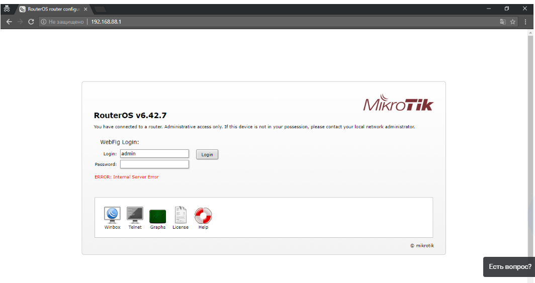 Рассмотрим настройку wi-fi роутера через эту утилиту более подробно. Прежде всего, нам нужно зайти на веб интерфейс Микротика. Для этого вводим в браузере «https://192.168.88.1». Заходим в настройки через введение логина и пароля. В месте ввода логина пишем «admin», а поле с вводом пароля оставляем пустым. После ввода нажимаем на кнопку «Login».