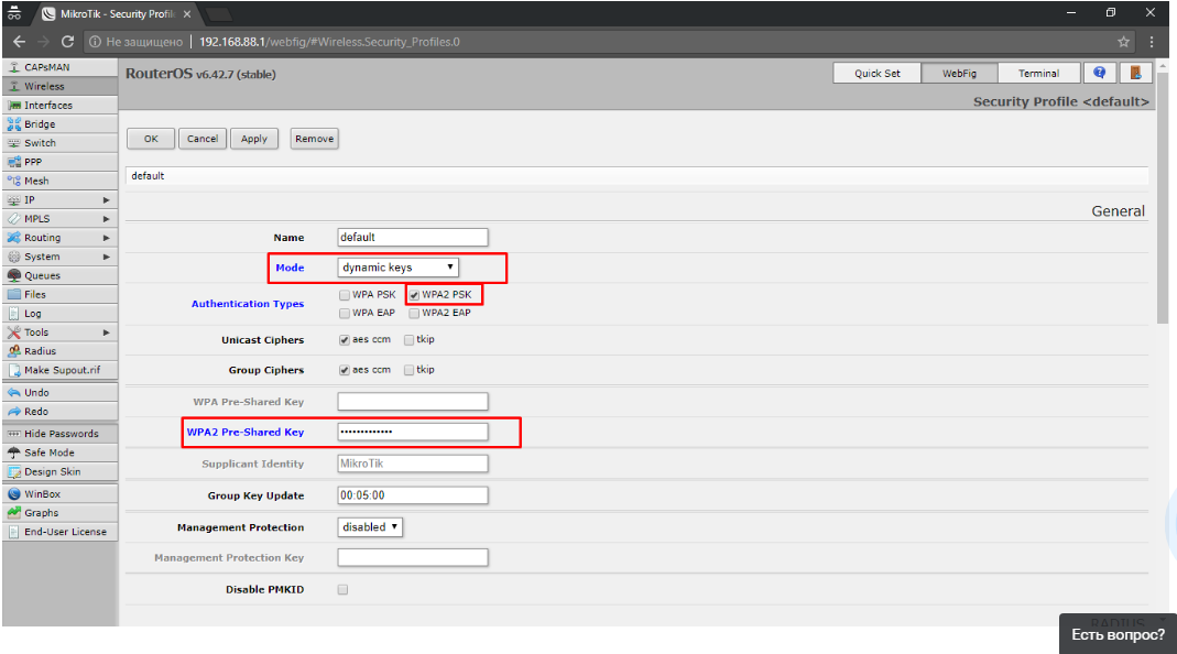 Откроется окно, где в «Mode» нужно выбрать графу «dynamic keys», возле «Authentication Type» выбираем галочкой «WPA2 PSK». В «WPA2 Pre-Shared Key» вводится пароль от wi-fi сети.