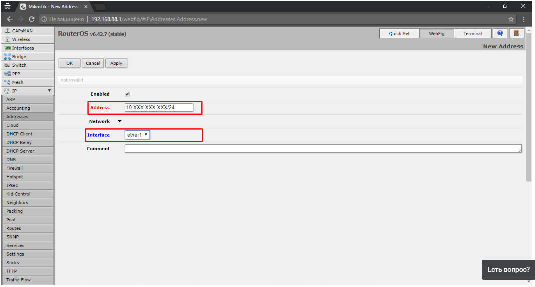 2. Вводим IP-адрес и добавляем в его конце /24. Зачем мы это делаем? Всё просто, это число соответствует маске подсети 255.255.255.0, потом выбираем «ether1» (бывают версии, где написано «ether1-gateway»);