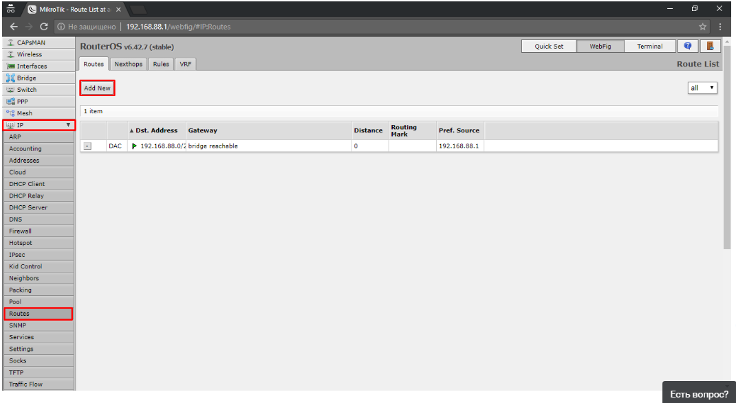 5. Нам нужна одновременная работа локальной сети интернета. Для этого снова заходим в «IP», там переходим во вкладку «Routes» и выбираем «Add New»;