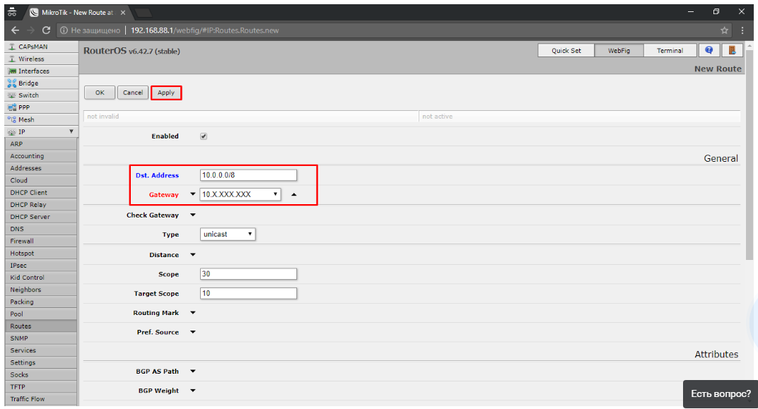 6. Выбираем «Dst. Address» и вводим в нём: 10.0.0.0/8, а в «Gateway» выбираем IP-адрес основного шлюза;
