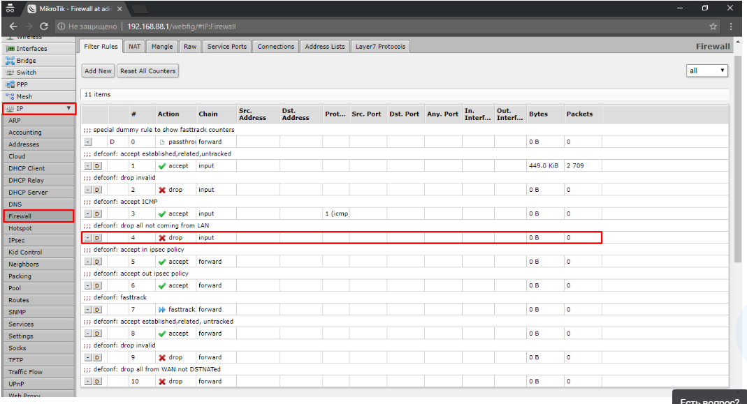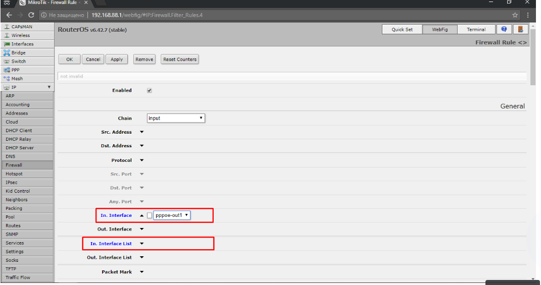 6. Можно приступать к редактированию пронумерованных правил. Выбираем 4 правило и убираем настройку в «In. Interface List». В «In. Interface» выбираем настройку «pppoe-out1»;