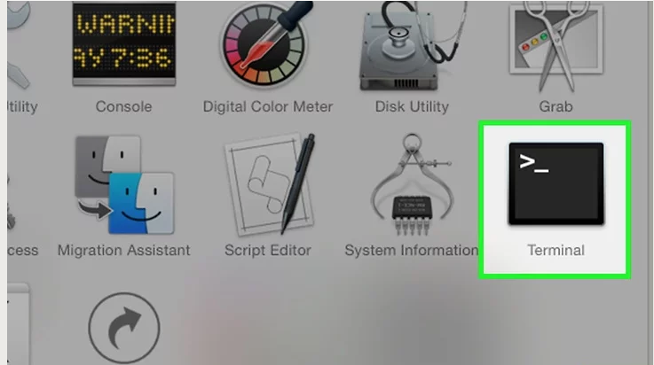 Открываем приложение «Терминал». Оно находится в подменю «Утилиты», которое находится в «Приложения»;