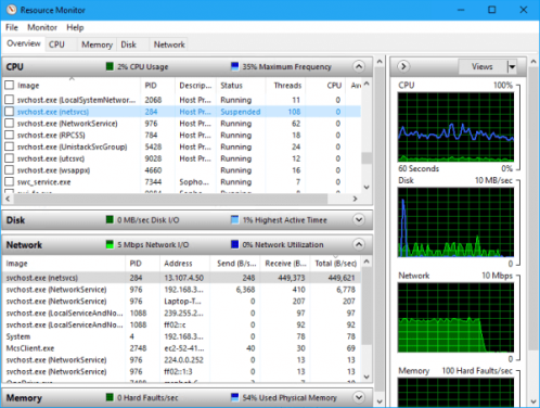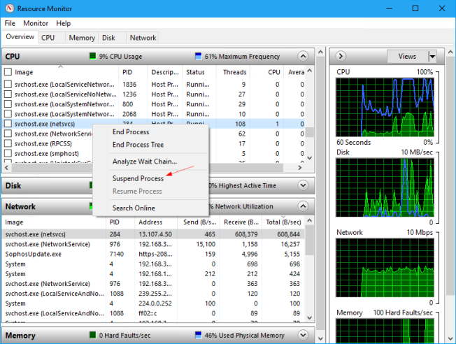 Откройте Монитор ресурсов, отсортируйте имя изображения на вкладке CPU, щелкните правой кнопкой мыши svchost (netsvcs) и выберите Завершить процесс.