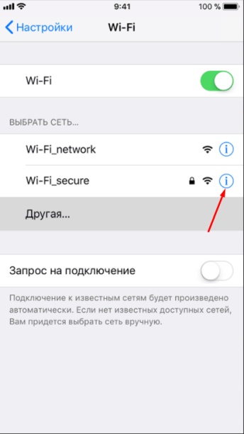 - Отыщите нужную сеть и кликните по иконке «Информация», похожей на i в кружочке.