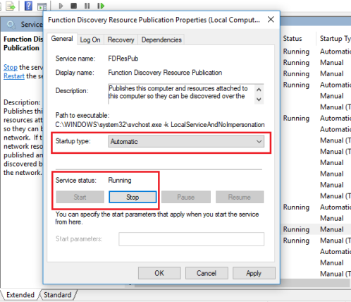 Здесь убедитесь, что тип запуска службы публикации ресурсов обнаружения функций — автоматический, и она запущена.