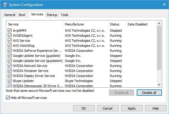 - Перейдите на вкладку «Службы», установите флажок «Скрыть все службы Microsoft» и нажмите кнопку «Отключить все».