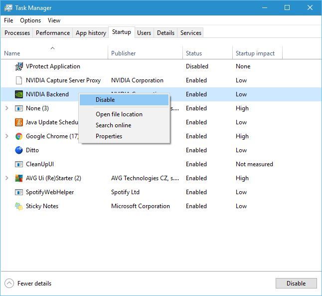 - Когда откроется диспетчер задач, вы увидите список запускаемых приложений. Щелкните правой кнопкой мыши каждый элемент в списке и выберите «Отключить».