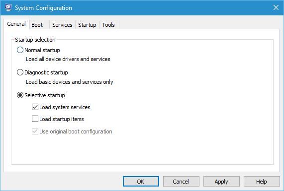 - Когда откроется окно Конфигурация Windows, выберите Выборочный запуск и снимите флажок Загружать элементы запуска.
