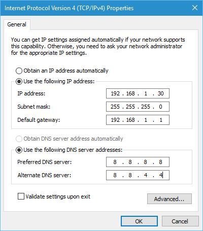 - Когда откроется окно «Свойства», выберите параметр «Использовать следующий IP-адрес» и введите IP-адрес, маску подсети и шлюз по умолчанию. Мы использовали настройки, которые работают для нашей конфигурации, но вам может потребоваться ввести другие данные. Кроме того, вам придется войти на DNS- сервер вручную. В нашем примере мы использовали общедоступный DNS Google, но вы также можете использовать 192.168.1.1 в качестве предпочитаемого DNS-сервера.