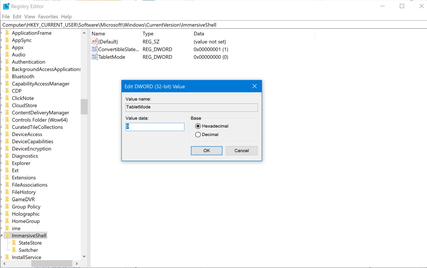 Теперь щелкните правой кнопкой мыши запись DWORD с именем TabletMode. Дважды щелкните по нему и установите его значение данных равным 0, а основание — шестнадцатеричным