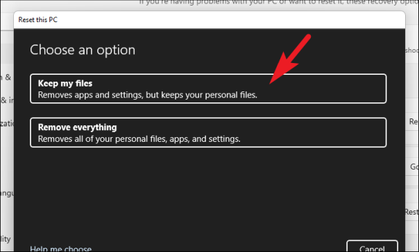 Нажмите, чтобы выбрать предпочтительный вариант на экране «Сбросить этот компьютер».