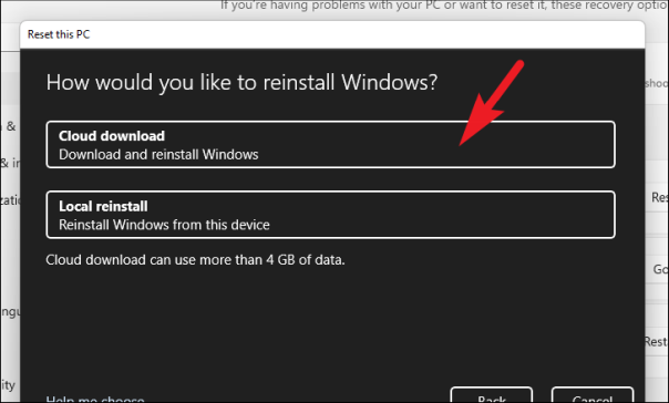 После этого вам нужно будет выбрать между «облачной загрузкой» и «локальной переустановкой». Облачная загрузка считается сравнительно более надежной и стойкой, чем «локальная переустановка», поскольку может быть вероятность повреждения или повреждения локальных файлов. Однако для опции «Облачная загрузка» потребуется активное подключение к Интернету.