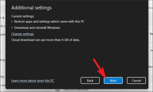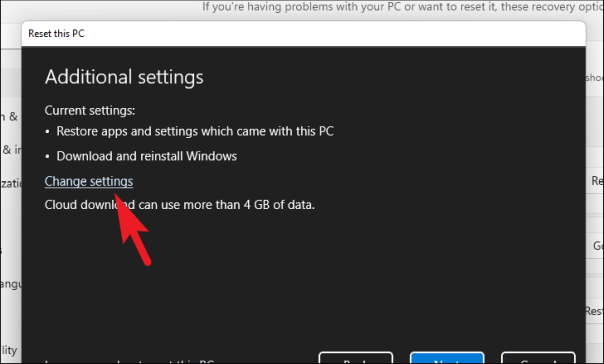 Далее вы увидите текущие настройки сброса вашего ПК. Если вы хотите изменить эти настройки, нажмите «Изменить настройки».