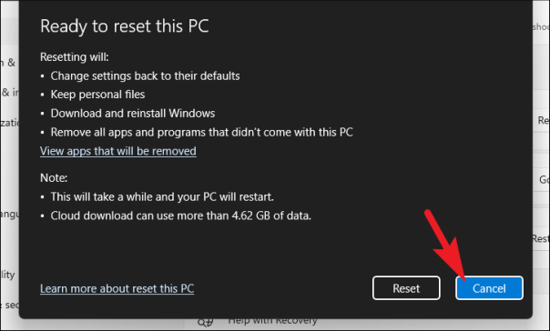Затем Windows перечислит все последствия перезагрузки вашего ПК. Прочтите и нажмите кнопку «Сброс», чтобы начать процесс сброса.