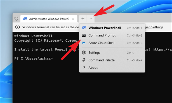 Теперь, если вы выбрали опцию «Терминал Windows», щелкните значок шеврона (стрелка вниз) на панели вкладок. Затем нажмите, чтобы выбрать опцию «Командная строка». Кроме того, вы можете нажать Ctrl+ Shift+ 2 , чтобы открыть вкладку командной строки.