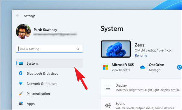 Затем нажмите на вкладку «Система» на левой боковой панели окна «Настройки».
