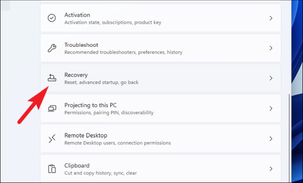 Теперь в правой части окна прокрутите, чтобы найти и выбрать параметр «Восстановление» из списка.