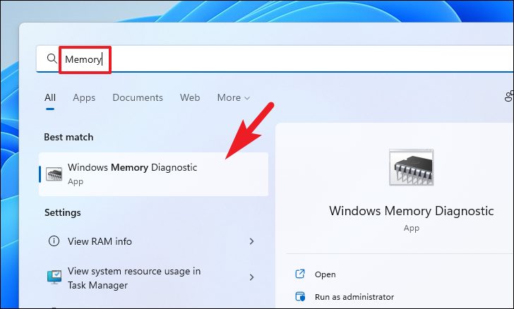 Сначала перейдите в меню «Пуск» и введите «Диагностика памяти», чтобы выполнить поиск. Затем в результатах поиска щелкните плитку «Диагностика памяти Windows», чтобы запустить приложение на своем компьютере.