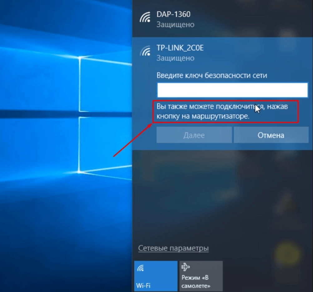 - Выберите нужную сеть и нажмите на неё. Вам предложат ввести пароль, а под полем для ввода будет надпись, извещающая, что подключение можно осуществить через кнопку на маршрутизаторе (роутере). Если эта надпись есть, то функция WPS поддерживается, остаётся нажать кнопку на роутере.