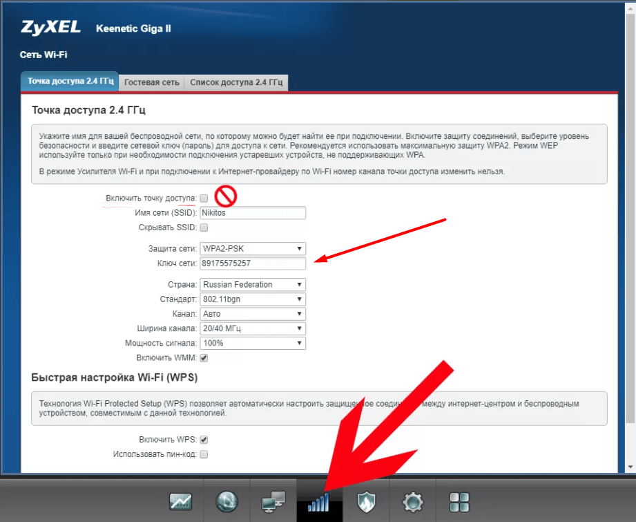 - Оказавшись в панели управления, кликните по иконке сети. Оставаясь на вкладке «Точка доступа», найдите строку «Ключ сети», в ней вы увидите пароль.