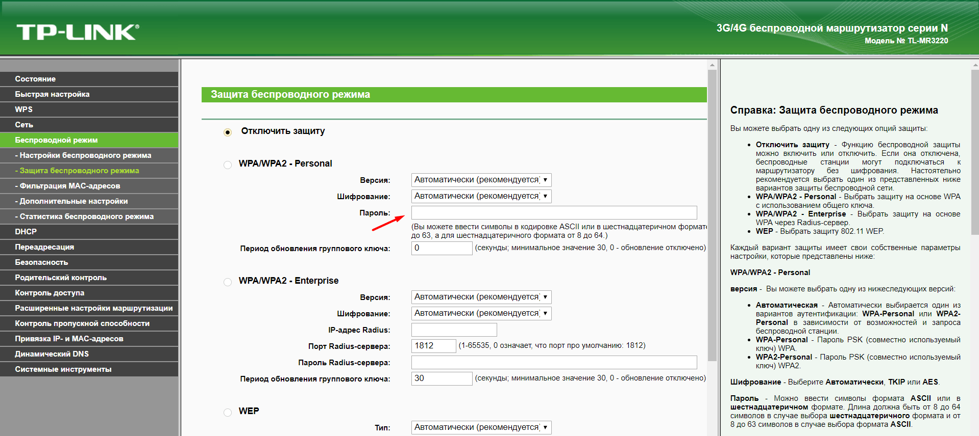- Перейдите к разделу «Беспроводной режим», а после — к подразделу «Защита беспроводного режима». Отыщите строку «Пароль», в которой будет указано искомое значение.