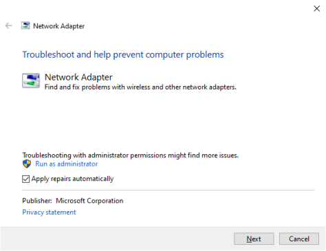 Нажмите Windows Key + S, введите сетевой адаптер и выберите Найти и устранить проблемы с сетевым адаптером . Теперь выберите «Дополнительно», затем установите флажок «Применить исправление автоматически», а затем «Запуск от имени администратора». На этом этапе вам, возможно, придется ввести пароль Windows.