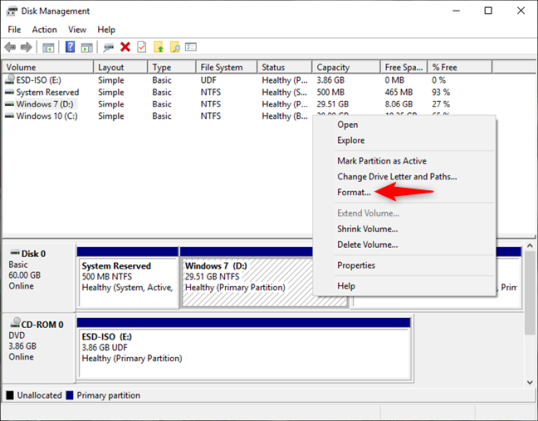 Если вы хотите повторно использовать тот же раздел для другой операционной системы, вам следует отформатировать раздел, а не удалять его. Например, если вы хотите удалить Windows 7, чтобы установить другую операционную систему, выберите раздел, щелкните его правой кнопкой мыши или нажмите и удерживайте его, а затем нажмите «Формат» в контекстном меню.