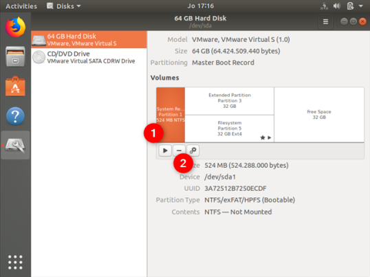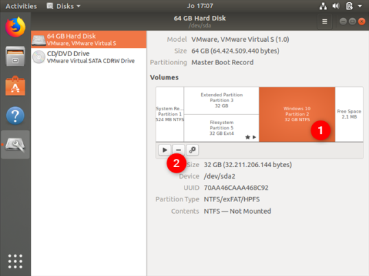 В приложении Disks выберите раздел Windows, который вы хотите удалить. Это должно быть легко обнаружить, потому что обычно он отформатирован с использованием NTFS. Выбрав его, нажмите кнопку — (минус) под списком томов.