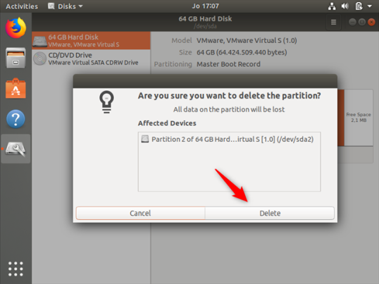 Ubuntu спрашивает, «уверены ли вы, что хотите удалить раздел». Нажмите Удалить.