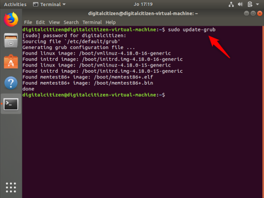 Откройте окно терминала, одновременно нажав клавиши Ctrl + Alt + T на клавиатуре. В Терминале введите команду sudo update-grub и нажмите Enter. Введите пароль учетной записи администратора и нажмите Enter еще раз.