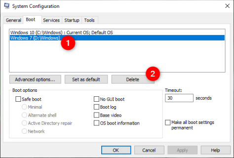 Далее выберите Windows, которую хотите удалить, нажмите «Удалить», а затем «Применить» или «ОК».